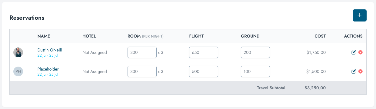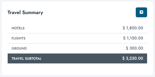The TRAVEL SUMMARY is an uneditable table showing totals from travel estimates entered on the travel tab of the project submenu. Specifics on travel data entry can be found in the TRAVEL section of this document.