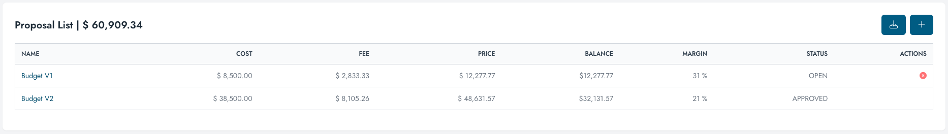 The PROPOSAL LIST is an interactive table showing financial data and status of various project proposals. Each proposal consists of PROPOSAL BUCKETS, each containing ESTIMATES. Within the propoal you can set margins on individual items as well as a percentage / agency fee on the proposal subtotal. To create a new proposal, simply click the PLUS SIGN in the top right corner, give the proposal a name, and submit. The proposal data can also be DOWNLOADED by clicking the download button. You can click on the PROPOSAL NAME to open and view the PROPOSAL DETAILS.