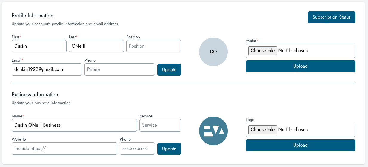 A key concept to understand behind the data in EvA-App, is that of the business unit. Though you can invite other users into your projects, your top level data (CLIENTS, VENDORS, VENUES, and COMPANIES) is specific to YOUR BUSINESS. When you created an account, you are assigned a unique BUSINESS ID and the first recommended step is to update your BUSINESS INFO. To do so, access your PROFILE via the ADMIN MENU as outlined above. Once in your profile, you can update your personal and business information, includiing profile pics and business logo.