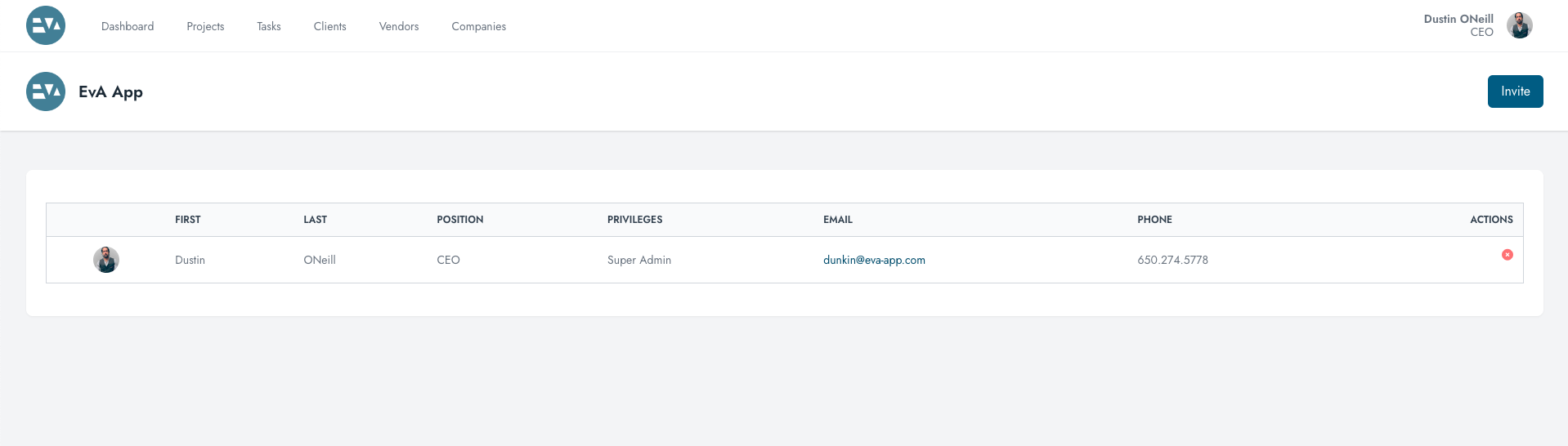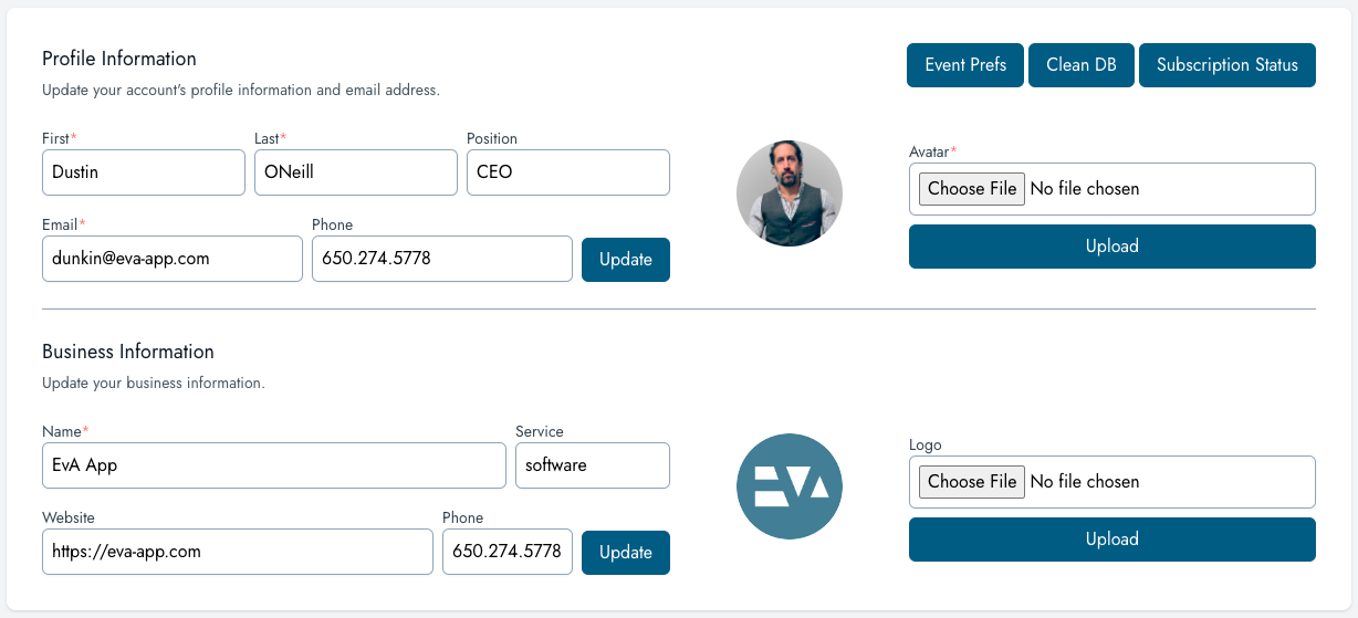 A key concept to understand behind the data in EvA-App, is that of the business unit. Though you can invite other users into your projects, your top level data (CLIENTS, VENDORS, VENUES, and COMPANIES) is specific to YOUR BUSINESS. When you created an account, you are assigned a unique BUSINESS ID and the first recommended step is to update your BUSINESS INFO. To do so, access your PROFILE via the ADMIN MENU as outlined above. Once in your profile, you can update your personal and business information, includiing profile pics and business logo.