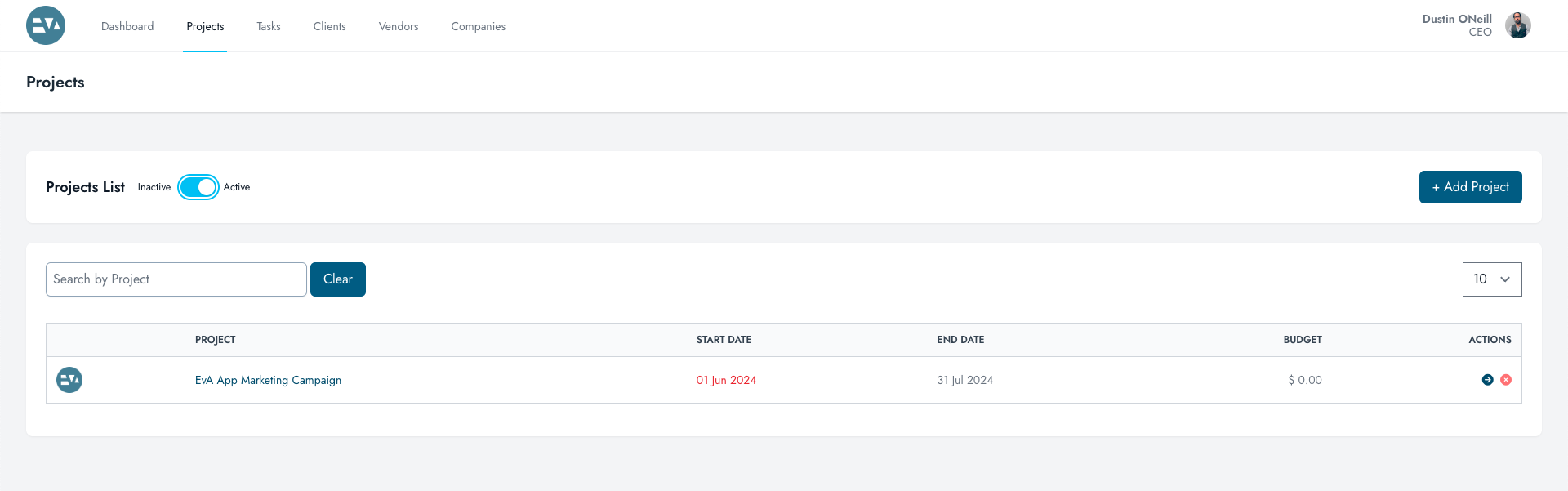 PROJECTS are a place to build teams, schedules, and share documents. It is also a place to assign data from your database which is a key principle behind EvA-App. The data is only as good as the data entered and, for best results, you are encouraged to complete details in each of the top level data sets (CLIENTS, VENDORS, VENUES, and COMPANIES). The top level page shows an interactive table of all current projects in START DATE order. The table is searchable by project and can toggle between active and inactive projects.