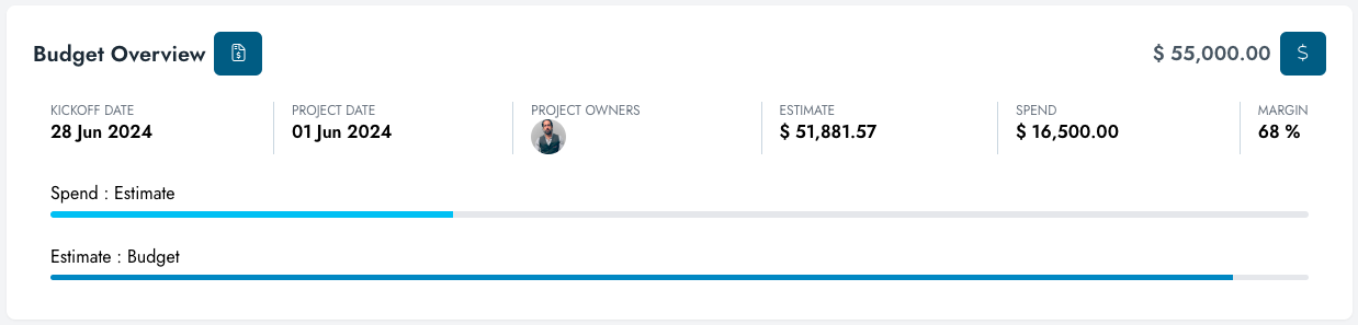 The BUDGET OVERVIEW card has key data to quickly provide the current status of the project financially. In the top right corner, there is the budget field. This will auto adjust to be the total of all estimates and travel expenses unless a budget number is entered. To enter a budget number manually, simply click on the button, enter a number, and submit. The KICKOFF DATE is simply the date that the project was created in EvA-App. The PROJECT DATE is the start given during the creation of the project.