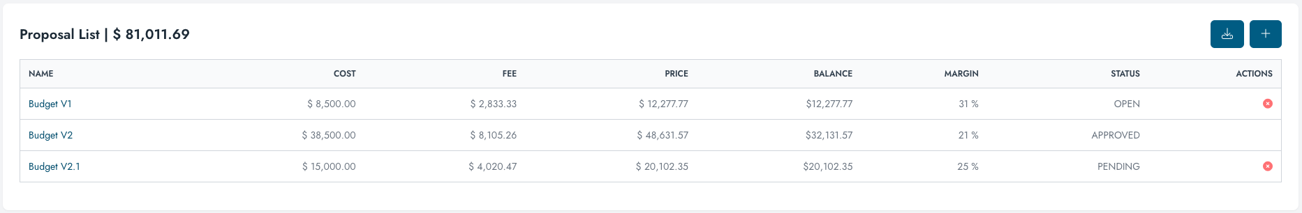 The PROPOSAL LIST is an interactive table showing financial data and status of various project proposals. Each proposal consists of PROPOSAL BUCKETS, each containing ESTIMATES. Within the propoal you can set margins on individual items as well as a percentage / agency fee on the proposal subtotal. To create a new proposal, simply click the PLUS SIGN in the top right corner, give the proposal a name, and submit. The proposal data can also be DOWNLOADED by clicking the download button. You can click on the PROPOSAL NAME to open and view the PROPOSAL DETAILS.