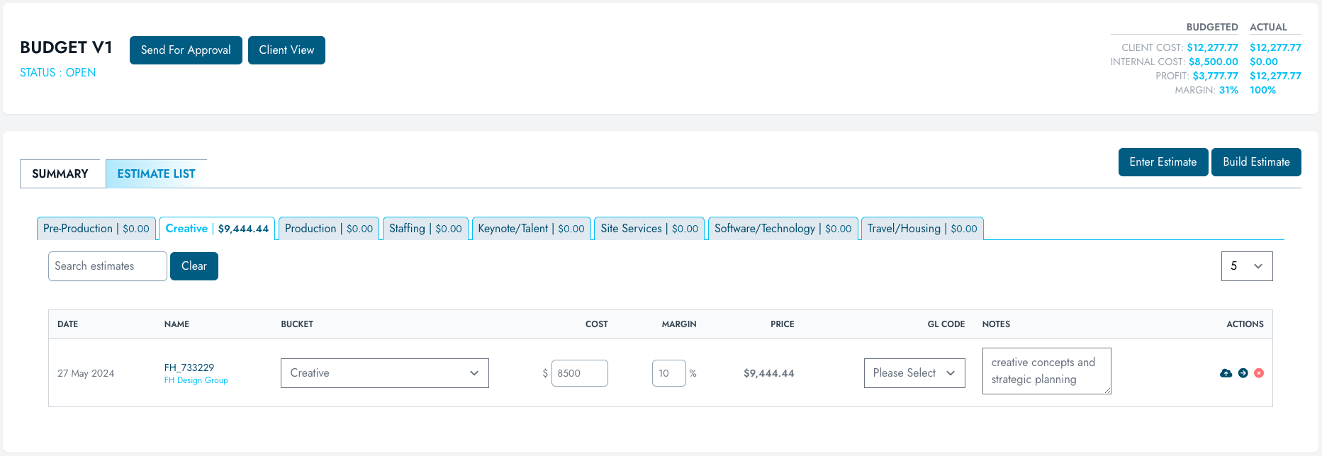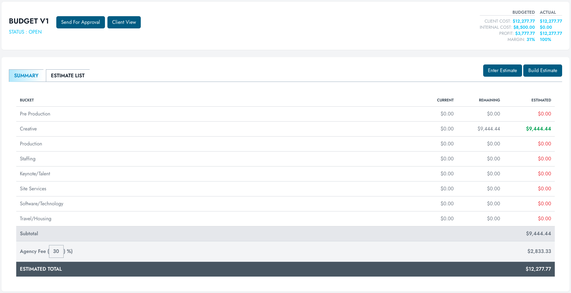 Proposals default to the OPEN state when created and, as such, can be modified or deleted. The base view on all PROPOSALS is the summary view. This can be switched by selecting the ESTIMATE LIST TAB. The SUMMARY VIEW shows the propoosal broken down by BUCKETS, the AGENCY FEE, and TOTAL. The AGENCY FEE is directly editable on the summary page only.
