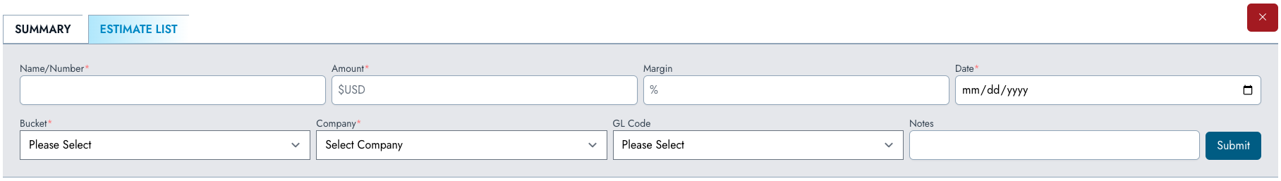 The ESTIMATE LIST view is organized by BUCKETS which can be accessed by clicking on the appropriate TAB. Each tab shows the bucket name and the current subtotal. Within each tab, there is an editable ESTIMATE LIST. Each line has editable fields for all pertinent data and allows for uploading a PDF as backup.