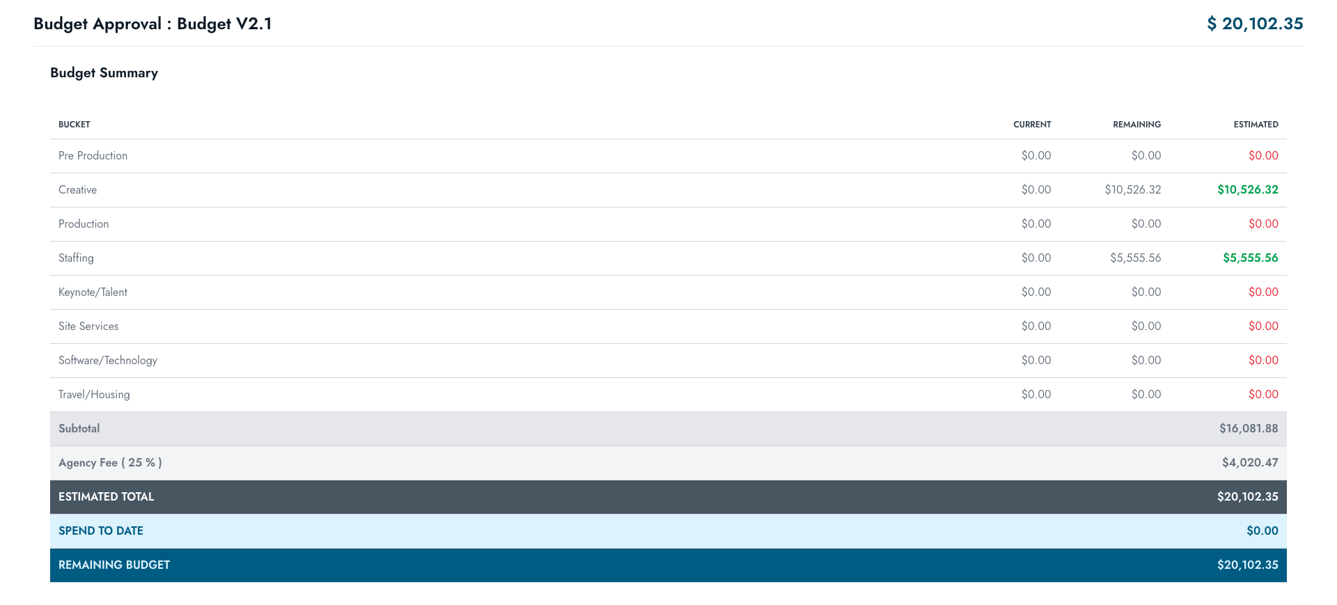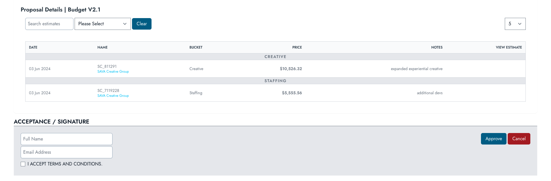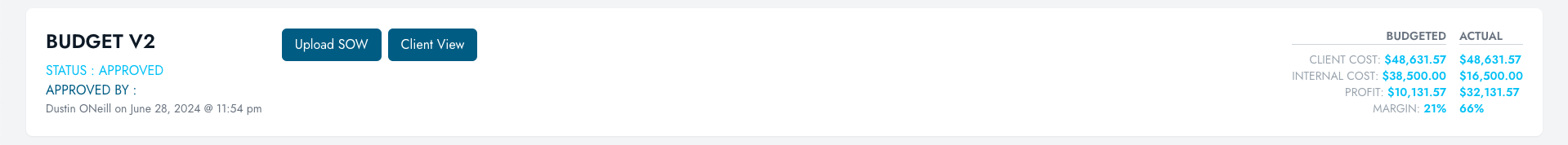 Once APPROVED a proposal is considered LOCKED and its TOTAL is added to the total ESTIMATED PROJECT BUDGET. In the APPROVED state, the header updates to show the timestamp and name of the APPROVER as well as the ability to UPLOAD SOW should that be appropriate. Also of note is that the AGENCY FEE is no longer editable.