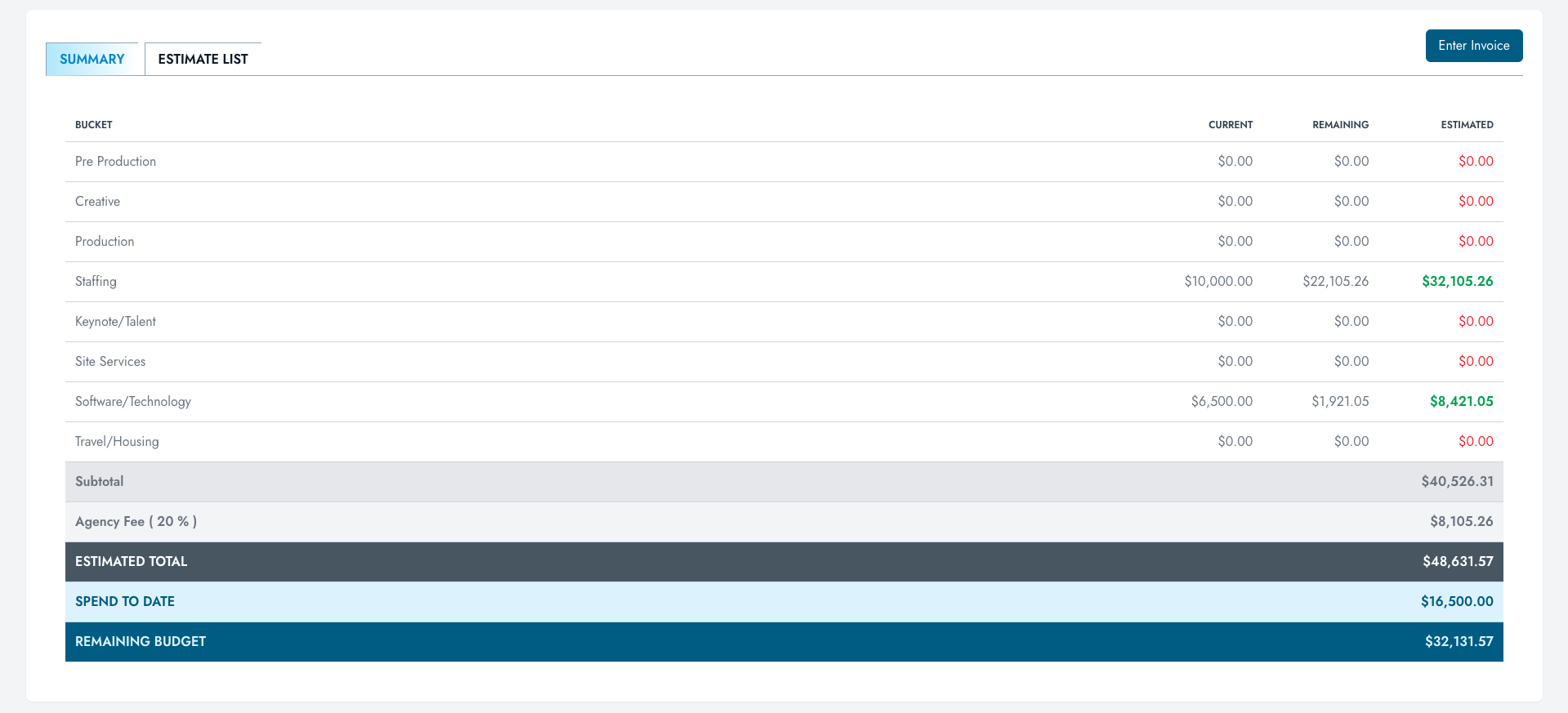 ESTIMATES can no longer be added to an APPROVED proposal, and the abilty to do so is replaced with the ENTER INVOICE button. Entering and invoice will update the SPENDS data for the event and be reflected in all calculations.