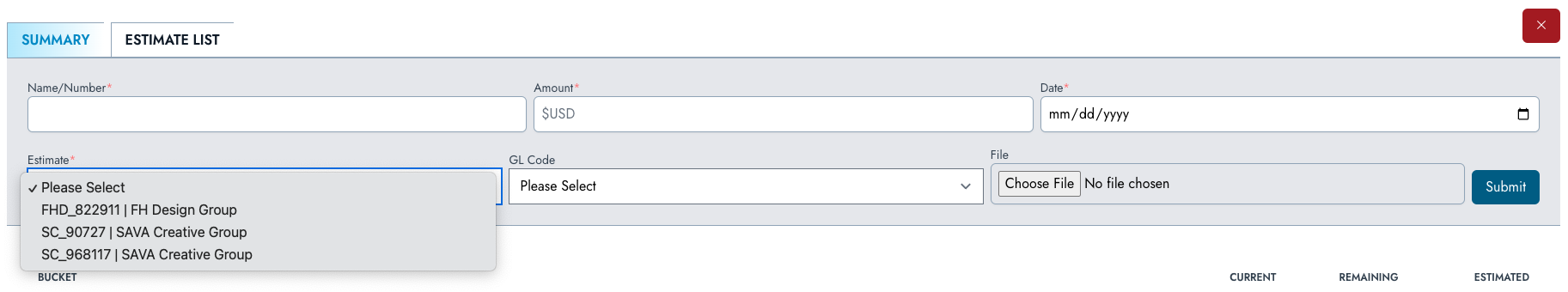 INVOICES must be reconciled against an estimate. This will update remaining budget per estimate as well as calculate the total spend vs total estimate for the project.The dropdown menu will automtically populate with approved estimates from the project.