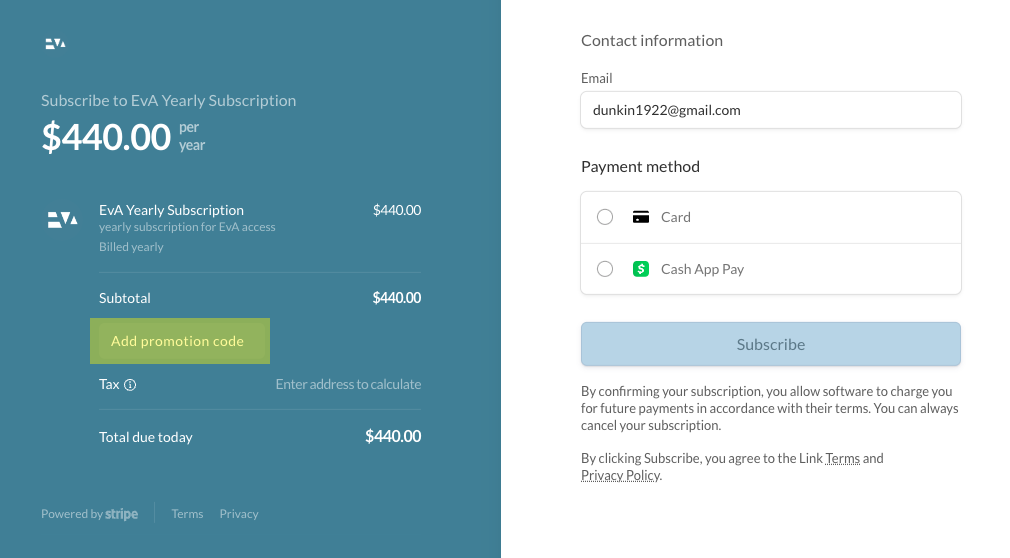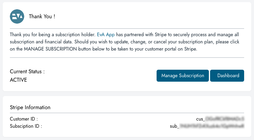 Once you select a subscription plan, you'll be redirected to the STRIPE BILLING PORTAL. Upon completing the payment form, you'll be redirected to EvA-App to unlock all of software's features.