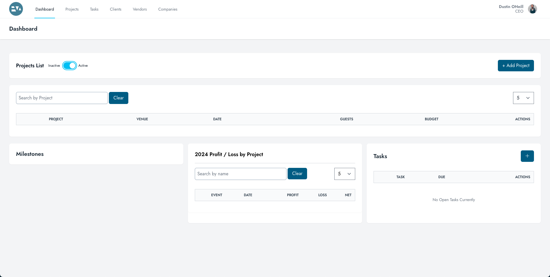 Your DASHBOARD is your landing page and starting point in the software. The general UI is based off of HORIZONTAL NAVIGATION along the top of the page and CARDS with headers indicative of the information contained in each CARD. As noted above, your ADMIN MENU can be found by clicking on your name in the upper right hand corner of the screen. Your DASHBOARD shows your active projects, upcoming milestones, financial overview, and upcoming open taaks for all projects.